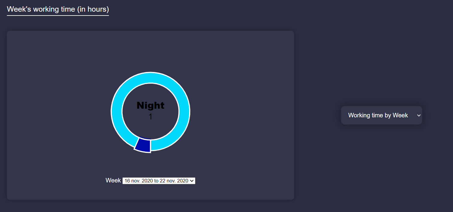 Cette page contient les statistique de l'utilisateur. elle contient trois graphiques : -Temps de travail par semaine : Donne le total des heures de travail par semaine (sélectionnée), en précisant le nombre d'heures de jour, de nuit et supplémentaires. -Temps de travail total : Donne le total des heures travaillées en précisant le nombre d'heures de jour, de nuit et supplémentaires. -Temps de travail journalier : Donne le total d'heures travaillées chaque jour.