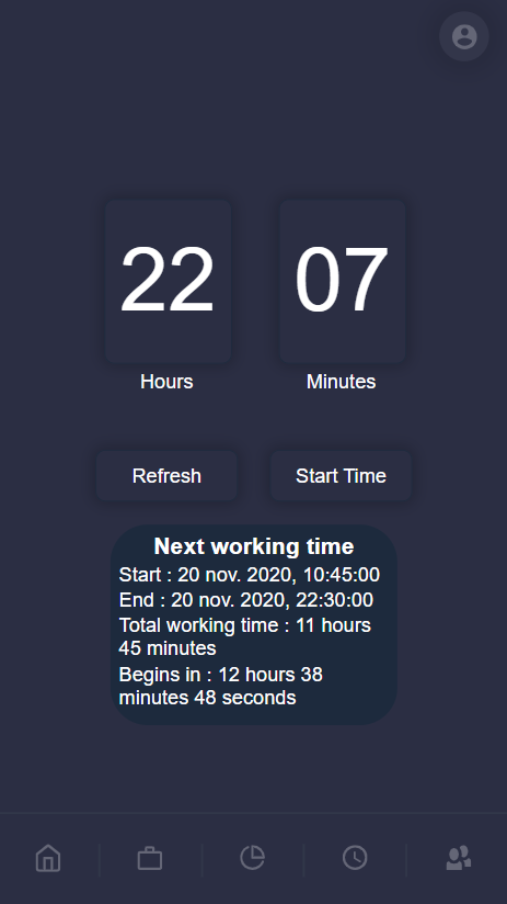 The box in the bottom shows current (or next if there isn't any running at the moment) working time's informations. In this screen there isn't any working time running, so it shows the next one, so we can't click on the start/end button.