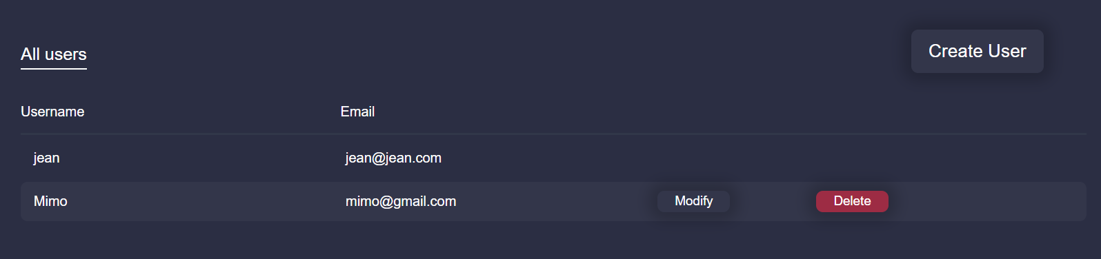 Only managers can create new users as it is a professional application. All users can edit their password or email but only managers can have acces to, and edit other users informations.
