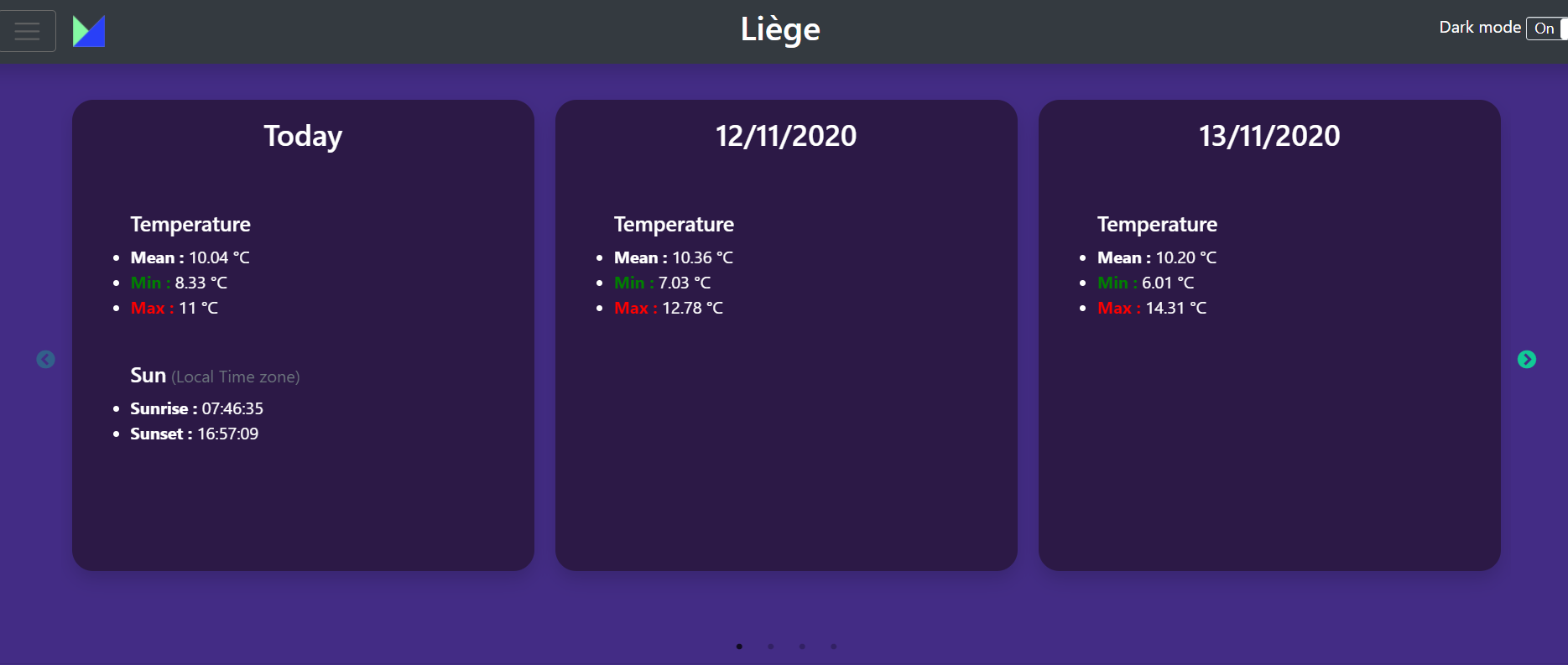 -Seuls les utilisateurs authentifiés peuvent avoir accès à l'application. -Ils peuvent se connecter ou créer un compte, ensuite ils peuvent enregistrer leurs villes pour avoir accès à leur météo actuelle dans la page d'accueil, ou aux prévisions dans la page de détails. -La météo est récupérée depuis OpenWeather API. -Les données sont enregistrées dans une bdd MongoDB. -Le frontend utilise Nunjucks. -L'application utilise plusieurs features de sécurité différentes.