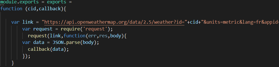 Il y a deux méthodes asynchrones : -Toutes les deux prennent l'ID d'une ville comme parametre et retournent un objet JSON (données brutes). -La première récupère la météo actuelle et la deuxième les prévisions.